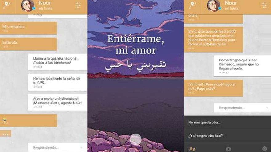 El título creado por los estudios The Pixel Hunt, Figs y Arte recrea una conversación entre la refugiada siria Nour y su marido Majd, quien es partícipe a kilómetros de distancia de los peligros que sufre su pareja. Nada más iniciarlo indica que es “una historia de ficción inspirada en hechos y personas reales”. Tan real, que podría ser una conversación de WhatsApp con un familiar o un conocido.