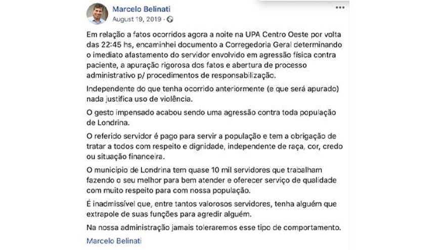 Con respecto al supuesto paciente, según aseguró el medio brasileño Folha, se trataba de un trabajador de la construcción que se había roto el brazo tras caerse de una escalera. En ninguna de las publicaciones de los medios brasileños se indicaba que esta persona fuera un un “inmigrante ilegal” en el país. Además, a la mañana siguiente de lo sucedido, el 19 de agosto, Marcelo Belinati el alcalde de esta ciudad brasileña, indicó en su perfil de Facebook que había solicitado la expulsión del facultativo. Además, añadió que “independientemente de lo que haya ocurrido anteriormente [...] nada justifica la violencia”.