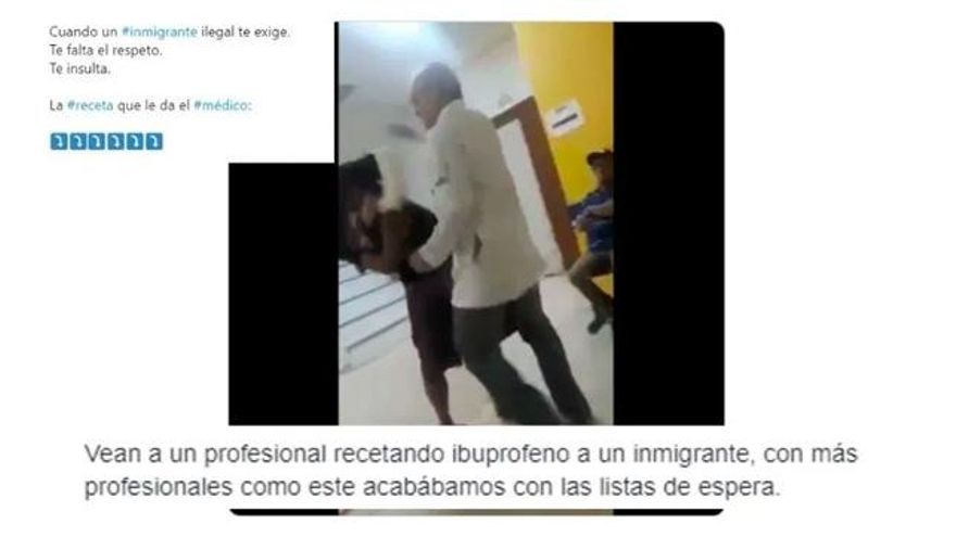 Un vídeo, en el que se veía a una persona con una bata que asesta una bofetada a un hombre con un brazo vendado, se compartió con mensajes como “Vean a un profesional recetando ibuprofeno a un inmigrante, con más profesionales como este acabábamos con las listas de espera” o “Cuando un #inmigrante ilegal te exige. Te falta el respeto. Te insulta”.