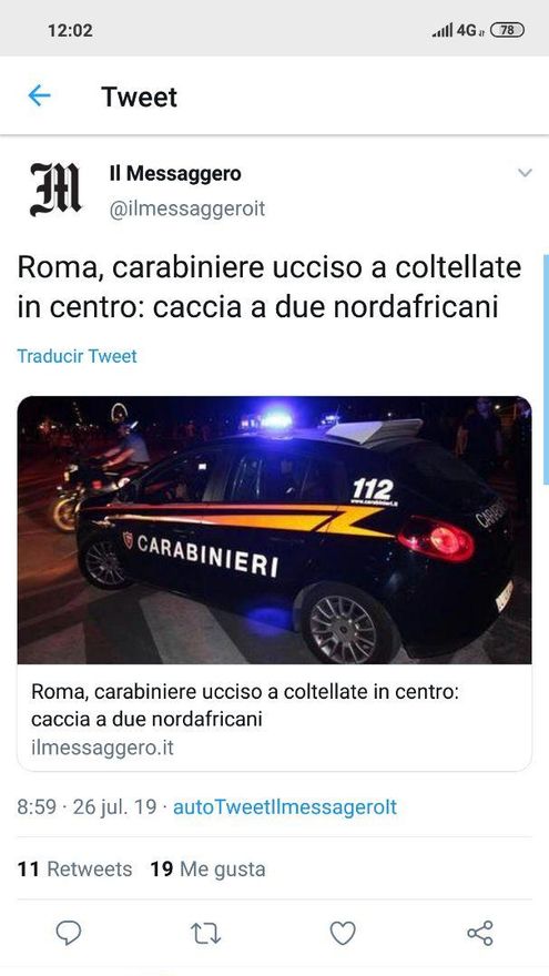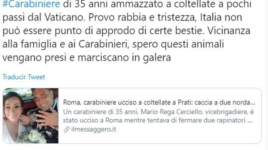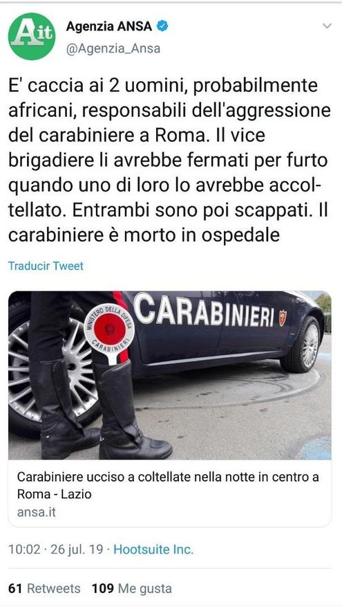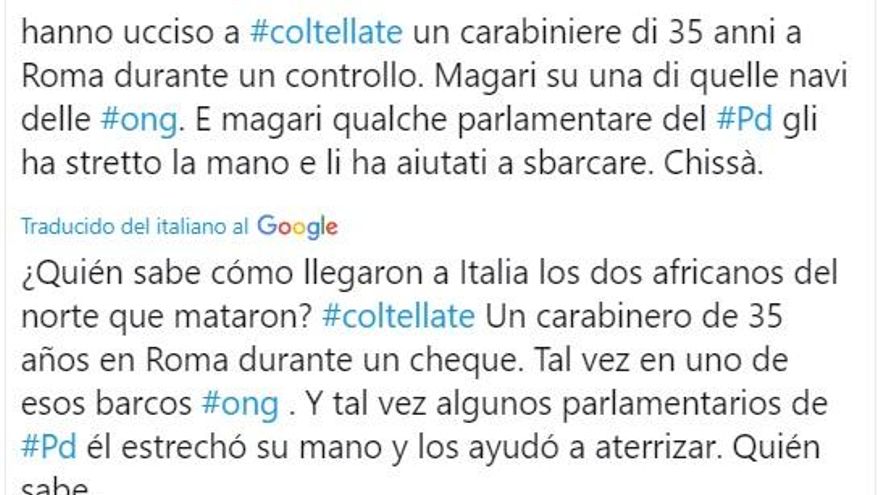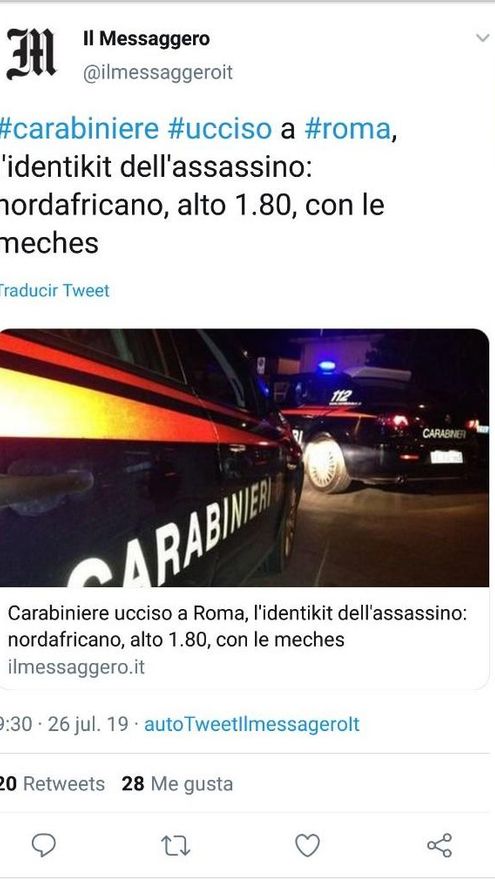 Además, medios como Il Messaggero publicaron que los agresores eran “dos norteafricanos”, un titular que difundió después Salvini. Desde su cuenta en Twitter publicaron tres tuits en relación al caso, el primero a las 8:59 asegurando: “Un carabinieri asesinado a puñaladas en el centro de Roma. Caza a dos norteafricanos”. Pese a que los titulares de las noticias ya han sido modificados, en ninguna de las piezas han dejado constancia del error.