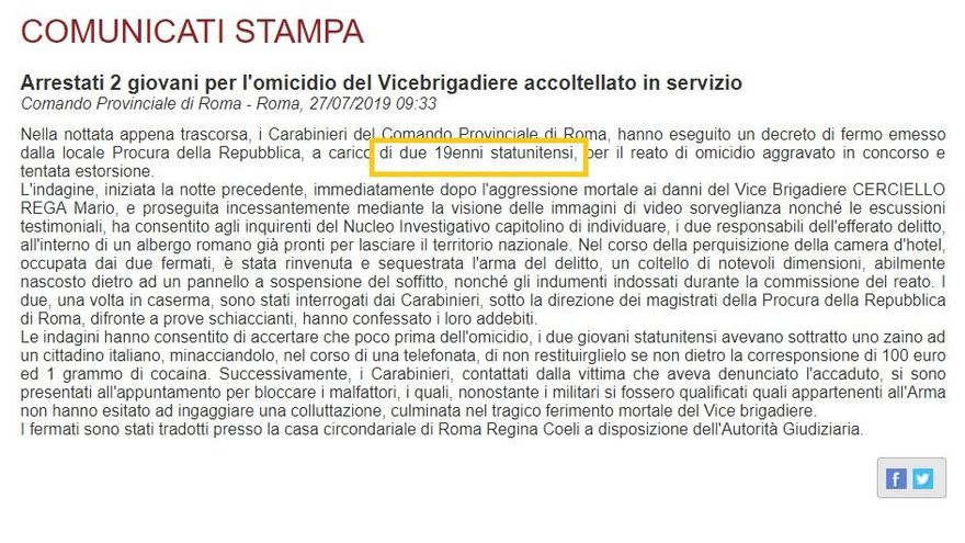 Pese a que ni en el post de Facebook, ni en el de Twitter (publicada a las 9:32) ni en Instagram ni en la web de los Carabinieri mencionaron la nacionalidad de los presuntos atacantes, el ministro del Interior, Matteo Salvini, desde su perfil de Facebook compartió una publicación de Il Messaggero que señalaba a “dos norteafricanos” como los presuntos asesinos de Mario Rega. (“Roma, carabiniere ucciso a coltellate in centro: caccia a due nordafricani”).