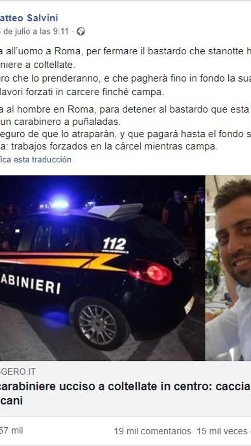 Desde aquí, el político llamó a dar “caza al hombre en Roma” para así “detener a ese bastardo que esta noche mató a un carabinieri a puñaladas”.