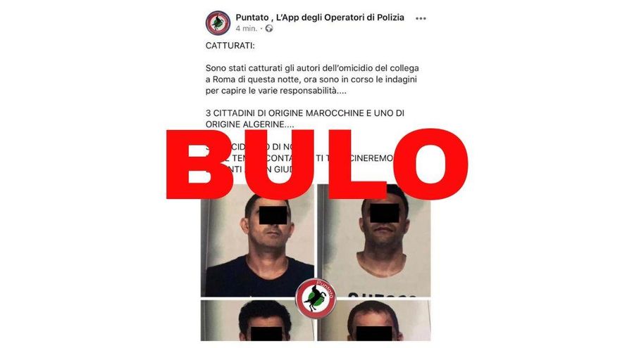 Según indican desde el medio italiano Wired, este bulo fue publicado por un colega de la víctima y, después, difundido por varias cuentas en Facebook que movieron las fotos tipo carnet de cuatro varones con el rostro parcialmente tapado. Aseguraban que se trataba de los supuestos atacantes: tres ciudadanos de origen marroquí y uno de origen argelino.