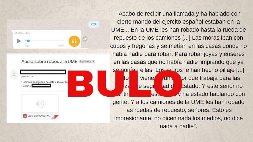 “En la UME les han robado hasta la rueda de repuesto de los camiones [...] Las moras iban con cubos y fregonas y se metían en las casas donde no había nadie para robar. Para robar joyas y enseres en las casas que no había nadie limpiando que ya se ponían ellas. Los moros le han hecho pillaje [...] Y a los camiones de la UME les han robado las ruedas de repuesto, señores”, indica la voz que protagoniza el audio. Sin embargo, desde la UME nos aclaran que, tras contactar con todas las unidades, no tienen “ninguna constancia” de que se les haya robado “ninguna rueda de repuesto a ningún vehículo de la UME”.