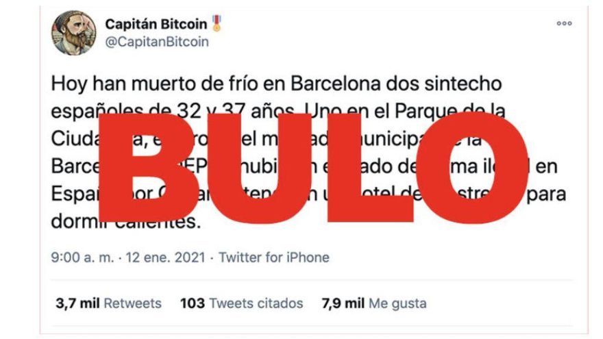 “Hoy han muerto de frío en Barcelona dos sintecho españoles de 32 y 37 años. Uno en el Parque de la Ciudadela, el otro en el mercado municipal de la Barceloneta. DEP. Si hubieran entrado de forma ilegal en España por Canarias tendrían un hotel de 4 estrellas para dormir calientes”. Este es uno de los mensajes con los que se ha difundido un bulo que enfrenta a españoles con inmigrantes y que afirma que dos hombres sin hogar fallecidos la noche del 11 de enero en Barcelona eran españoles. Los mensajes aseguran que si hubieran sido inmigrantes no habrían muerto de frío en la calle. Sin embargo, ambos fallecidos eran inmigrantes marroquíes.