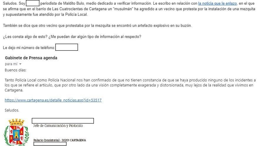 Sin embargo, no hay una prueba de que esto haya sucedido. Hemos hablado con el Ayuntamiento de Cartagena, con la Policía Nacional y Local y Guardia Civil y ninguno tiene constancia de un artefacto explosivo en el buzón ni de una supuesta agresión.