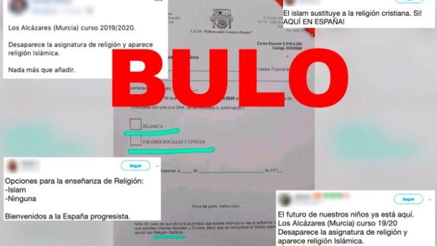La viralización fue en cuestión de horas, no sabemos quién pudo originar el bulo, pero una supuesta circular del colegio Conejero Requiel (Los Alcázares, Murcia) a elegir entre varias asignaturas (la enseñanza islámica y la asignatura de valores cívicos) y tuits en el que aseguran que “desaparece la asignatura de religión y aparece religión islámica” no es cierto.