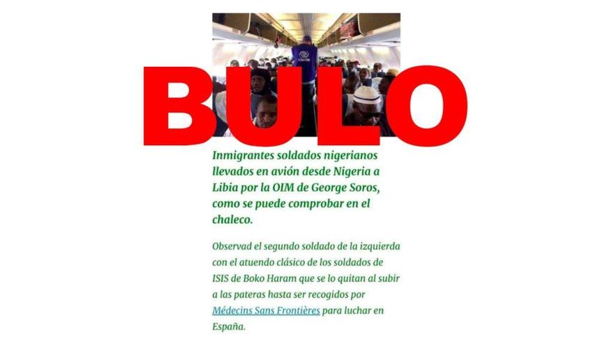 En los últimos días nos habéis preguntado por una imagen de decenas personas subidas en un avión que supuestamente iban a ser llevadas de Nigeria a Libia por la Organización Internacional para las Migraciones (OIM) para subirlos a una patera y que fueran rescatados por Médicos sin Fronteras “para luchar en España”. No es cierto.