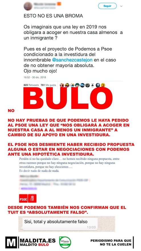 Se trataba, supuestamente, de una negociación entre Podemos y PSOE para que este último fuese apoyado en “una investidura”. “¿Os imagináis que una ley en 2019 nos obligara a acoger en nuestra casa al menos a un inmigrante? [sic]”, se preguntó un usuario en Twitter en diciembre de 2018. “Pues es el proyecto de Podemos a PSOE condicionado a la investidura del innombrable @sanchezcastejone en el caso de no obtener mayoría absoluta. Ojo mucho ojo!”, alarmó.