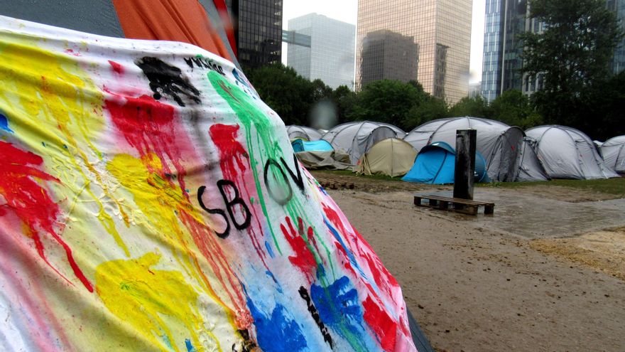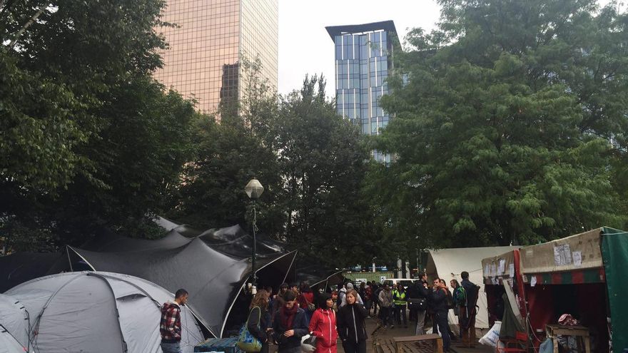 Tiendas de campaña de diferentes tamaños y colores se levantan en hileras desordenadas que ocupan casi todo el parque. En el suelo, mojado por las intermitentes lluvias que ya comienzan a anunciar el otoño belga, hay palés de madera que hacen las veces de puente para sortear los enormes charcos que se forman. El problema empieza a ser el frío que empieza a apretar e irá en aumento.