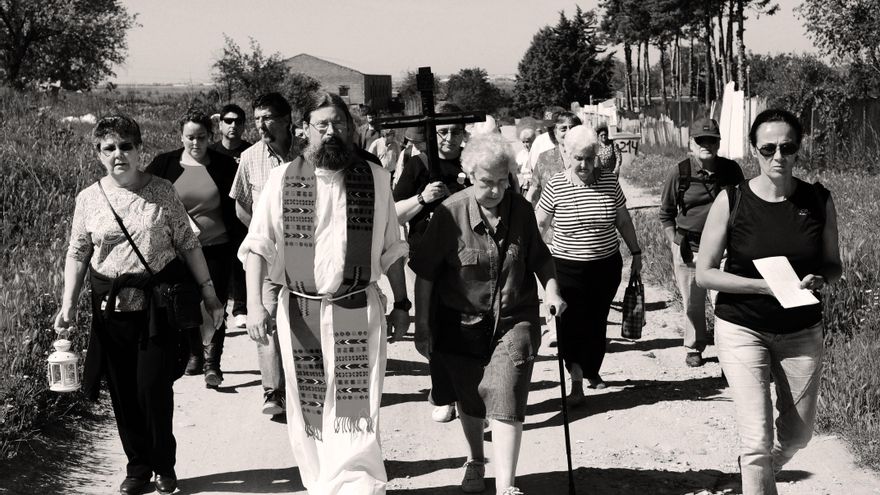 Comienza el camino de unos pocos kilómetros y sus participantes cantan: “Camina pueblo de Dios, camina pueblo de Dios”. Los niños se asoman por las puertas y ventanas. Los que juegan en la calle se paran atónitos a observar. ¿Quién ajeno al barrio se pasea voluntariamente por él? Un niño pedalea su bici sin neumáticos. Rueda directamente sobre el hierro de la llanta: “¿Dónde vais?”, pregunta. “A la iglesia de los payos”, responde el padre Agustín.