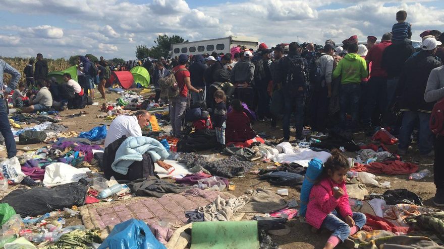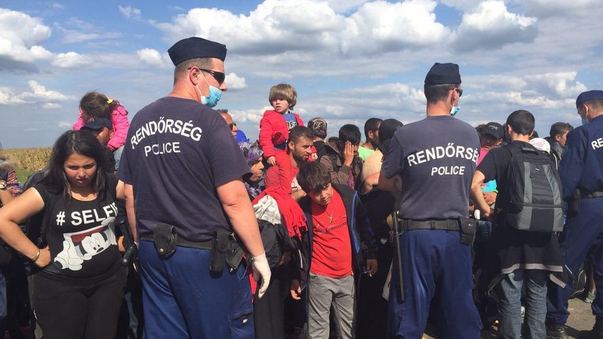 “¡Hola! ¿Qué hacemos? ¿Cuál es el mejor camino?”. La voz viene del otro lado de la verja que separa Serbia de Hungría. Quien pregunta es Nabil, un hombre de mediana edad, acompañado de una veintena de personas más. Han venido caminando desde Serbia -y antes desde Macedonia, y antes desde Grecia- y no se atreven a cruzar la frontera sin cotejar antes el terreno. Cuando comprueban que no hay policía, pasan y caminan siguiendo la vía del tren que los lleva al primer punto de retención, una pradera extensa situada junto a un maizal, rodeada de cientos de policías y cubierta de una alfombra de basura que las autoridades no se ocupan de recoger.