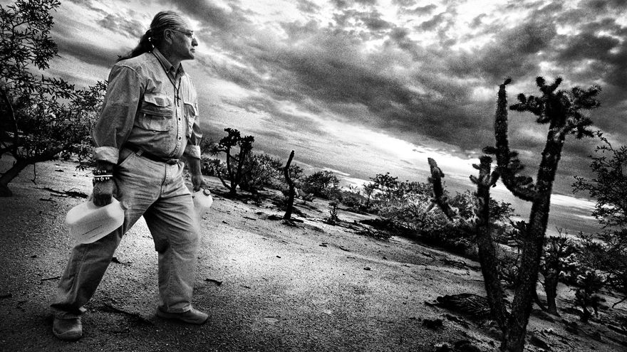 La foto superior está tomada cerca del lugar donde ocurren los hechos que relata la organización. Destaca la figura de Mike Wilson, que porta unas cantimploras de agua que coloca en mitad del desierto con la esperanza de evitar que el terreno en el que se asienta su hogar continúe como el cementerio de aquellos que buscan el sueño americano. Pero no es lo único que hace. También organiza, con el rechazo de sus más allegados, misiones para que las familias de los desaparecidos puedan buscar a sus seres queridos y los objetos que traían consigo.