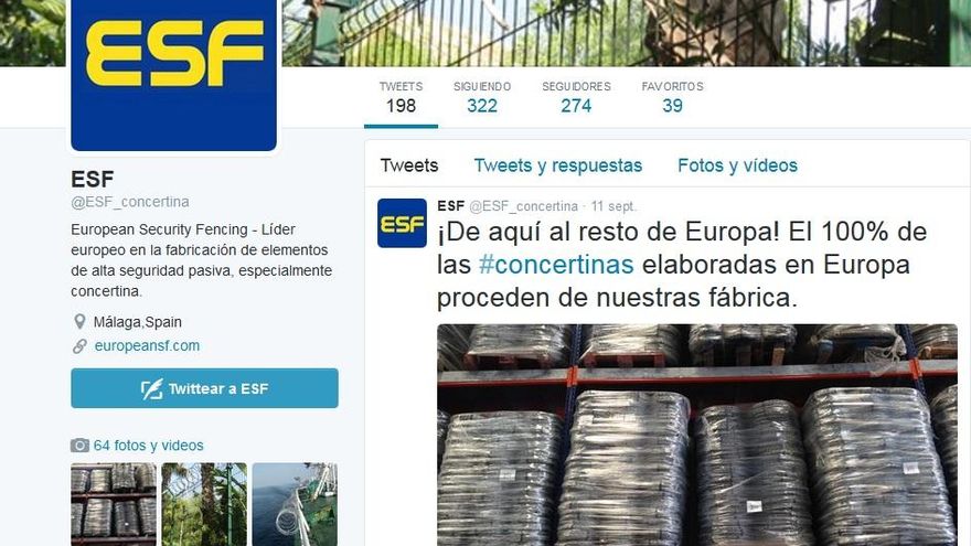 El pasado 11 de septiembre, en plena crisis de refugiados, el día que el primer ministro de Hungría anunció que la policía detendría a cualquier persona que intentase entrar de forma irregular en su territorio, la empresa española ESF compartió en Twitter un comentario que levantó numerosas críticas. “¡De aquí al resto de Europa! El 100% de de las #concertinas elaboradas en Europa proceden de nuestras fábrica”, decía el tuit.