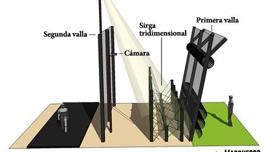 Este gráfico muestra la composición y límites de la valla de Melilla. Puede consultarse de manera interactiva aquí.