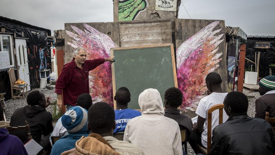Varios chicos subsaharianos están sentados en unas viejas sillas escolares, en medio de unos barracones de madera en el norte de Francia. Miran con atención a un voluntario que intenta enseñarles francés. A su alrededor solo hay descampados, lo que hasta el mes de marzo fue la parte sur de la jungla, antes de ser desmantelado. En el campamento improvisado, situado en la ciudad de Calais, sobreviven miles de migrantes que llegaron hasta allí con la esperanza de cruzar al Reino Unido.