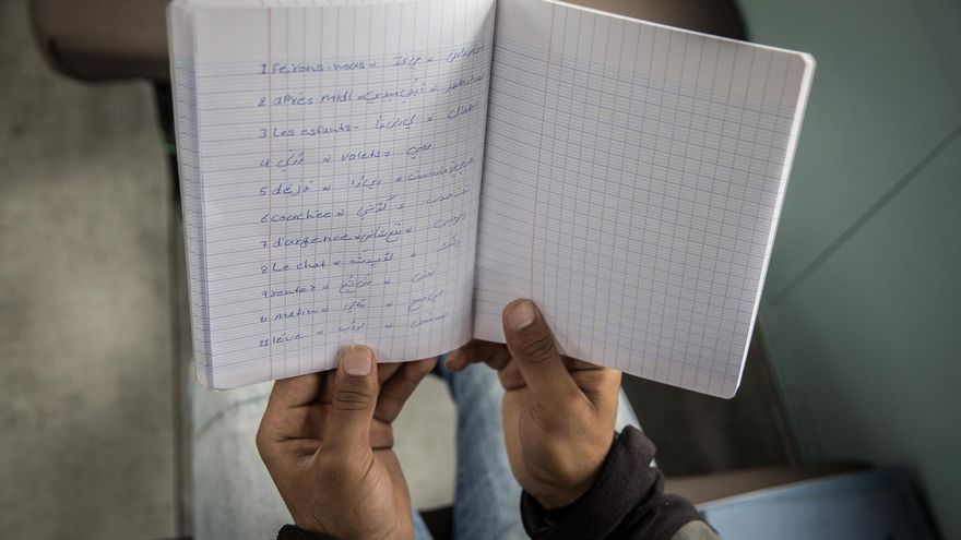 Tangany es uno de ellos. En las instalaciones de la 'École laïque du Chemin des dunes' (Escuela Laica de la carretera de la dunas) el joven sudanés de 21 años intenta escribir correctamente algunas palabras en francés en un pequeño cuaderno. Lleva dos años en el campo y acude tres días a la semana para aprender el idioma a esta escuela, una de las al menos cinco que hay en el campo, algunas dependientes de organizaciones y otras independientes, gestionadas por voluntarios. “Nos ayuda mucho”, dice Tagany.
