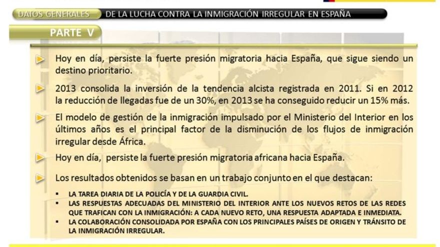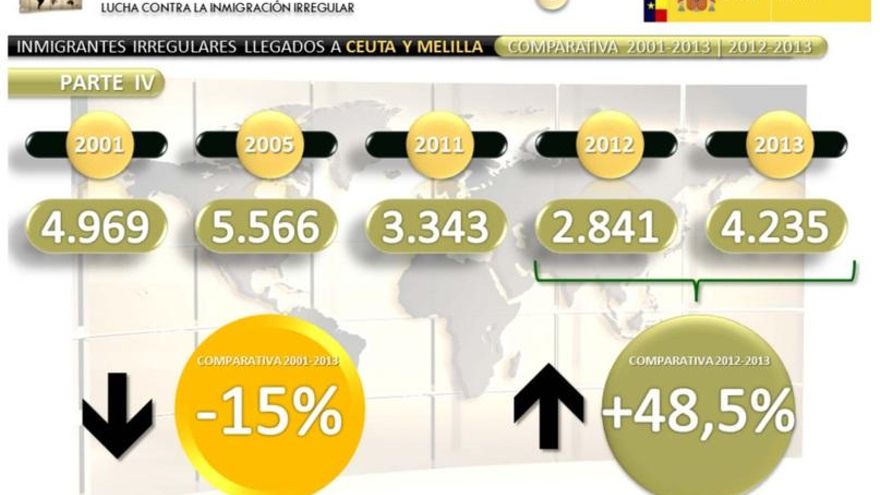 El efecto es clarificador en el último balance: mientras accedieron a España más personas por estos flujos en 2013 (7.467) que el año anterior (6.645), el informe solo menciona descensos excepto en una de sus páginas: se trata de la única referencia a las llegadas a Ceuta y Melilla, que ascendieron un 48,5% respecto al año anterior. Las conclusiones del informe ocultan este incremento y sentencian: “2013 registra los 'mejores' resultado -el Gobierno considera 'mejores', los datos descendientes- con mucho menor presupuesto: Trabajo, eficiencia y compromiso”. Interior no especifica que la bajada se da únicamente en las entradas por las costas españolas. El total, sube.
