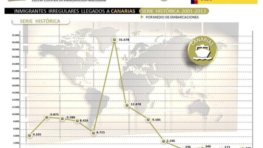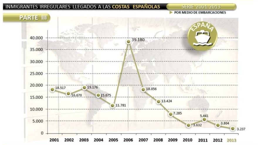 - 2006. Para explicar las entradas por vía marítima. Durante ese año entraron 39.180 personas (31.678 a Canarias y 7.502 a la Península y Baleares) a las costas españolas, el mayor número de la historia. El incremento fue puntual y durante los años posteriores retornaron a niveles habituales.