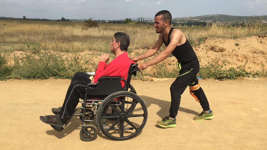 Sale una silla de ruedas y sobre ella un hombre que no es viejo es empujado por su hijo, que sí es joven, y que lleva vendada la rodilla, castigada de haber traqueteado cuesta arriba y cuesta abajo con el transporte desvencijado de su padre. No cogen agua, no cogen comida, no se entretienen porque si lo hacen se quedarán atrás en el grupo y porque el hijo necesita parar de vez en cuando para respirar y aliviar la pierna.