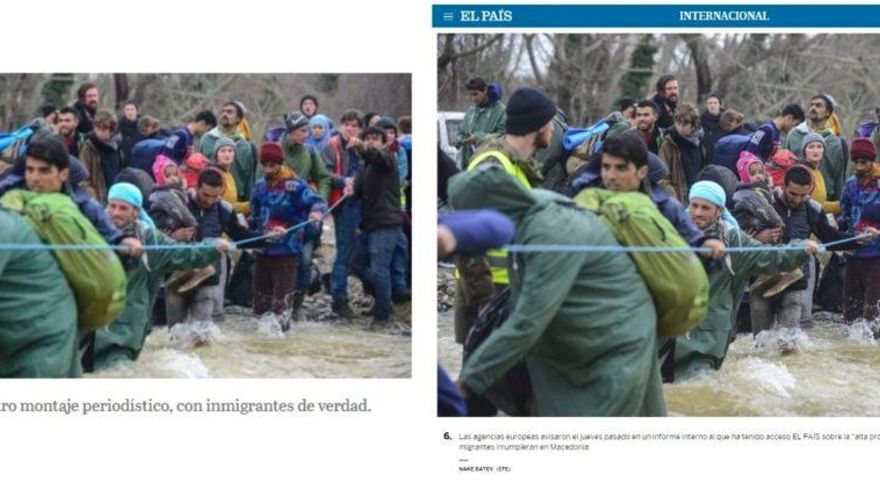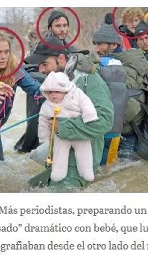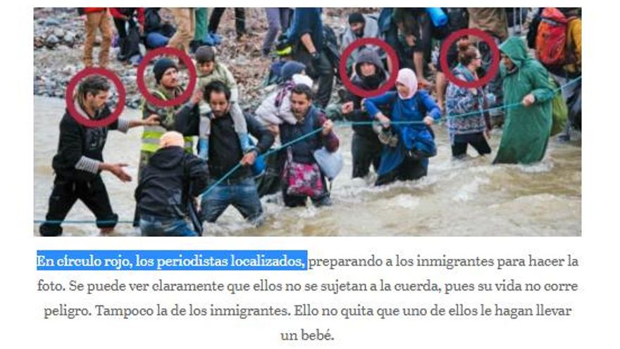 Estas imágenes se han movido desde la web Somatemps indicando con un círculo que quienes ayudan a cruzar a estas personas son supuestamente periodistas. Para decir esto se basa en el medio austriaco Kronen-Zeitung y en la web alemana Junge Freiheit, los cuales cuentan cómo, supuestamente, fueron cooperantes los que organizaron dicho cruce y no hablan de montaje o manipulación periodística.