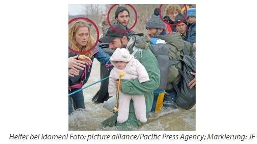Somatemps también publica una imagen en la que aparecen varias personas rodeadas con un círculo de las que dice son “más periodistas, preparando un posado dramático”, pero Junge Freiheit habla de “cooperantes en Idomeni”.
