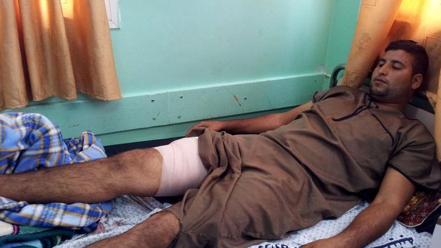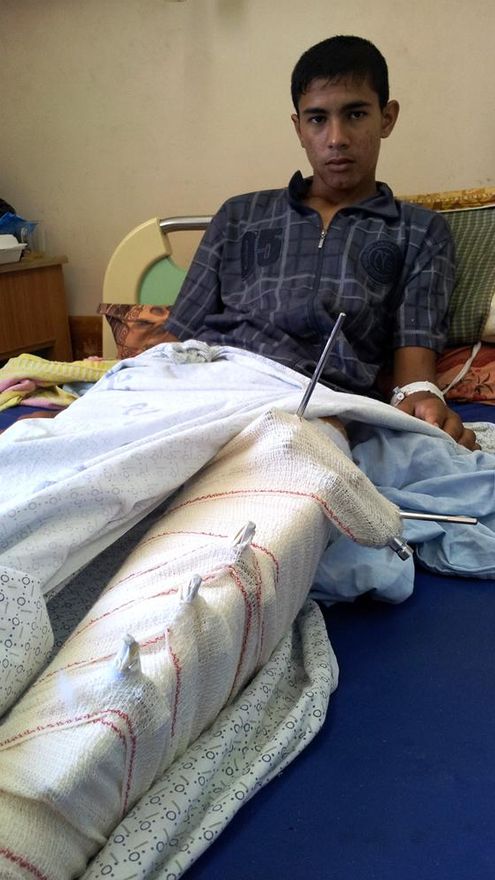 Tras la operación, Yuma’a tiene dos grandes cortes detrás de la rodilla debido a la cantidad de metralla que han tenido que extraerle. En esta ocasión, el disparo también fue cerca de la rodilla. “Querían romperme la rodilla, querían dejarme inválido. He perdido unos 200 gramos de músculos, me cortaron venas y tendones. Fue una bala explosiva. Me tuvieron que enviar al hospital central de Gaza, Shifa, donde me operaron dos veces y me dieron doce puntos”.