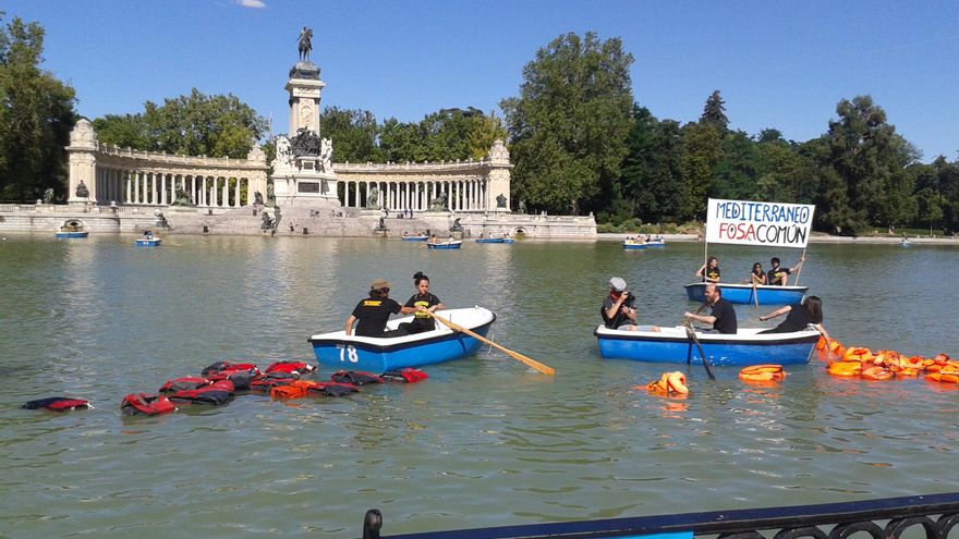 La tarde del 20 de junio, en el emblemático estanque del Parque del Retiro, se podían ver chalecos no homologados flotando en el agua, barquitas con pancartas en las que podía leerse “UE MATA” o “MEDITERRÁNEO FOSA COMÚN” y la recreación de una valla coronada por alambre de espino. El motivo: “rendir un sentido homenaje a quienes siguen desobedeciendo esas fronteras que se hacen muros inexpugnables para los senderos de norte a sur”, como así han explicado los organizadores de la acción, la Red Solidaria de Acogida, en la lectura del manifiesto.