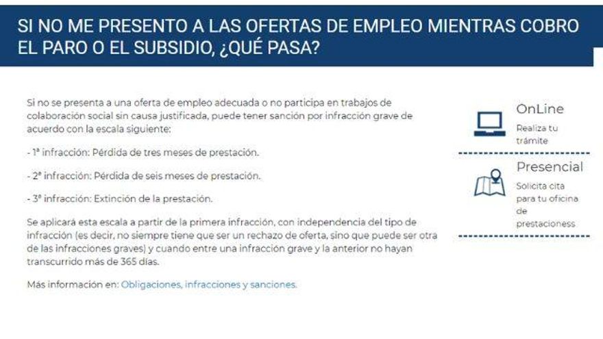 Aparte de demostrar que ha buscado activamente empleo, la persona no debe haber rechazado una oferta de empleo adecuada a su perfil, ni haberse negado a participar en acciones de promoción, formación o reconversión profesionales u otras para incrementar la ocupabilidad. En el caso de no cumplir con estos compromisos de actividad la persona puede ser sancionada con la pérdida de la prestación.
