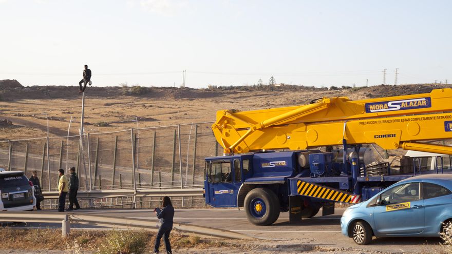 La enorme maquina amarilla se desplazó alrededor de las siete de la mañana a la zona de la valla conocida como Barrio Chino. Una vez allí, dos agentes antidisturbios de la Guardia Civil se subieron a la grúa junto a un operador de Mora Salazar para bajar de la valla al menos a las dos personas que estaban encaramadas en los postes. Los agentes forzajearon y le convencieron para subirlo en la canasta del vehículo de la empresa fabricante del alambre de cuchillas con el objetivo de expulsarlo.