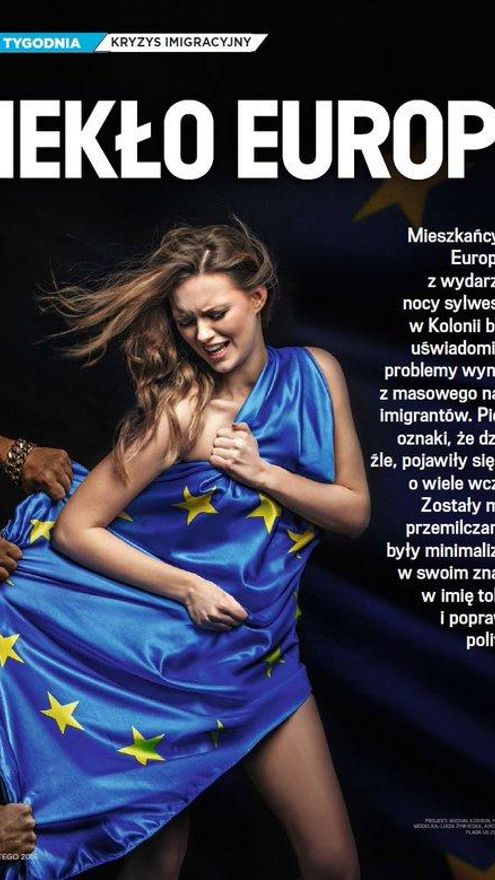 “Violación islamista en Europa”. La frase acompaña la imagen de una mujer semidesnuda cubierta con una impoluta bandera europea que intenta escapar de las manos que la agarran con fuerza. Ella es blanca y rubia, y se aferra al símbolo comunitario con desesperación. Los brazos que la acosan, oscuras. Es la nueva portada de la revista polaca ultraderechista 'wSieci', que una vez más despierta la polémica por su clara posición xenófoba.