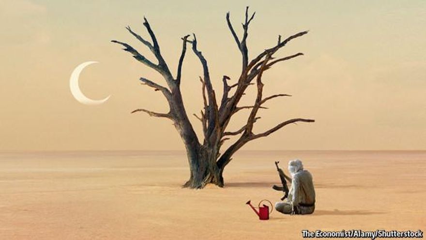 La portada de The Economist del mes de julio muestra las ramas de un árbol seco en medio del desierto. Sentado frente a él, envuelto en una túnica y turbante blancos, un hombre sostiene un arma con la mano derecha. A su izquierda, una regadera de color rojo destaca sobre la nada que se extiende a su alrededor. En lo alto brilla la luna creciente, símbolo del Islam. “¿Ha fracasado la Primavera Árabe?”, es el título del reportaje.