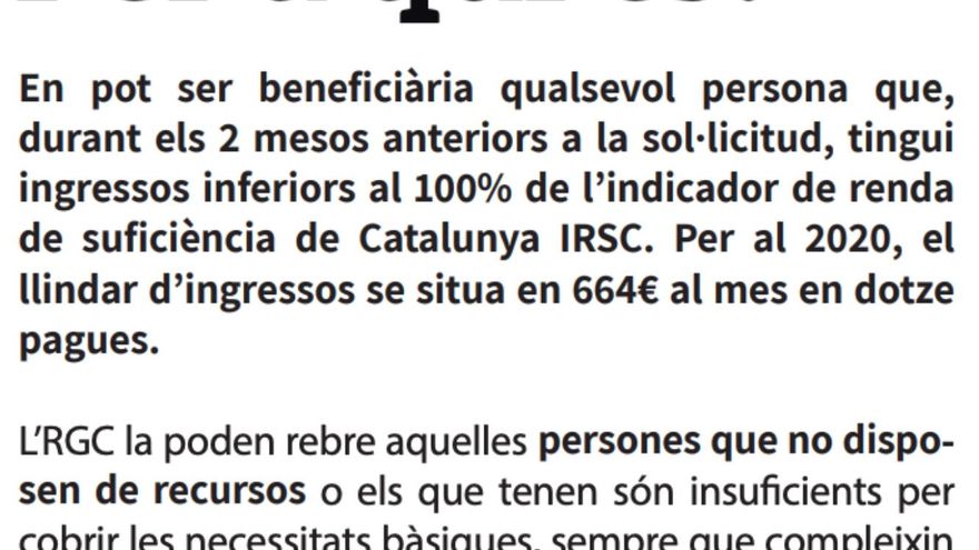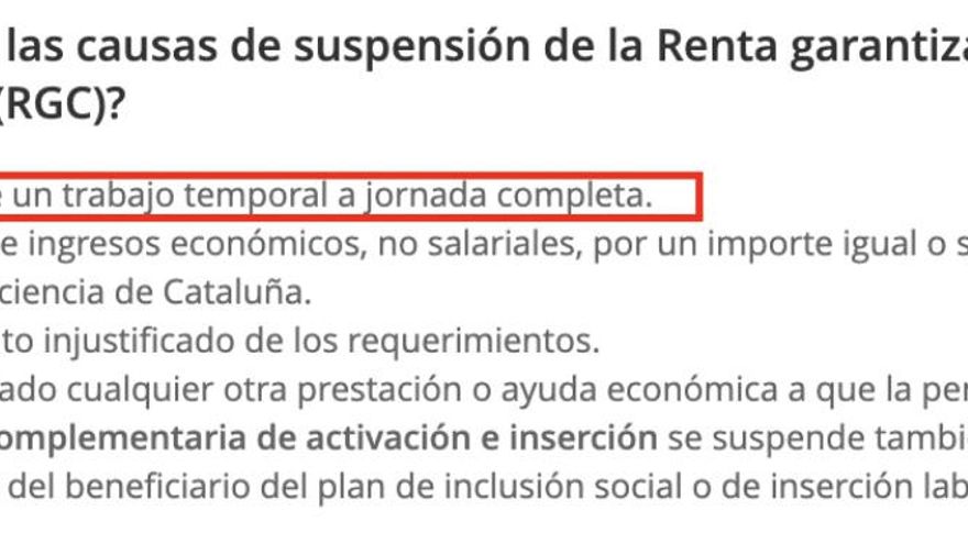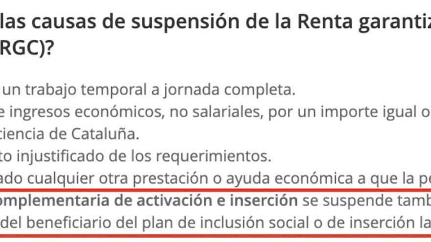 Además, en la web de la Generalitat se especifica que para seguir percibiendo esta ayuda “la persona beneficiaria debe responder de manera activa, comprometida y responsable para superar su situación mediante un itinerario de inserción laboral que le garantice autonomía e independencia económica”. También se detalla que un motivo para dejar de percibir esta ayuda es “el incumplimiento del beneficiario del plan de inclusión social o de inserción laboral”.