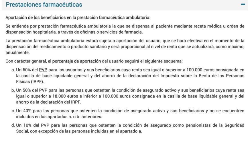 También especifica que estarán exentas del pago de medicamentos “personas perceptoras de rentas de integración social”, “personas perceptoras de pensiones no contributivas” o “parados que han perdido el derecho a percibir el subsidio de desempleo en tanto subsista su situación”. Por lo tanto, el supuesto caso de esa mujer y su familia sí sería una de las posibilidades para recibir medicamentos gratis, pero se trata de una situación relacionada con su renta.