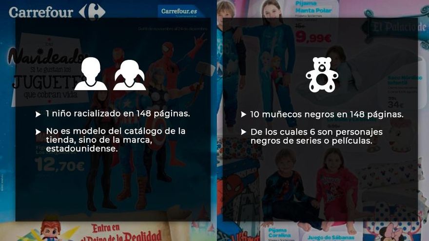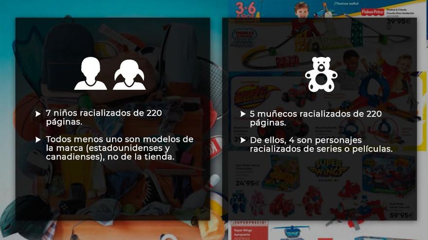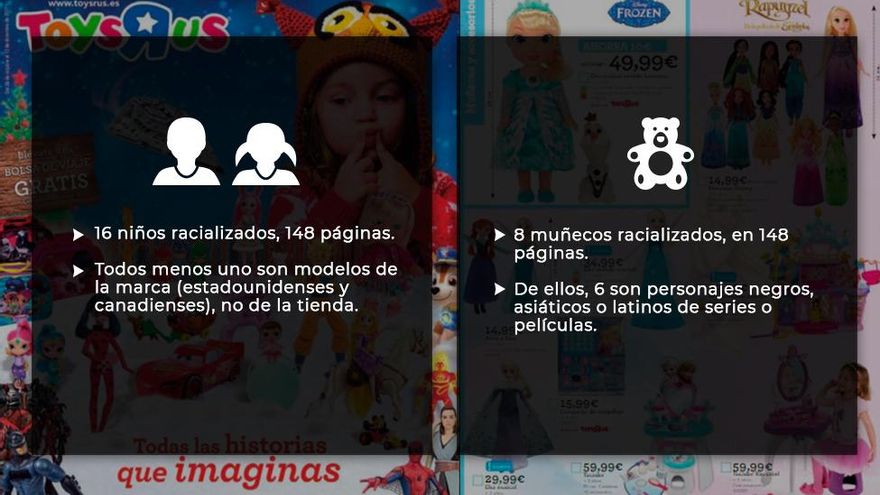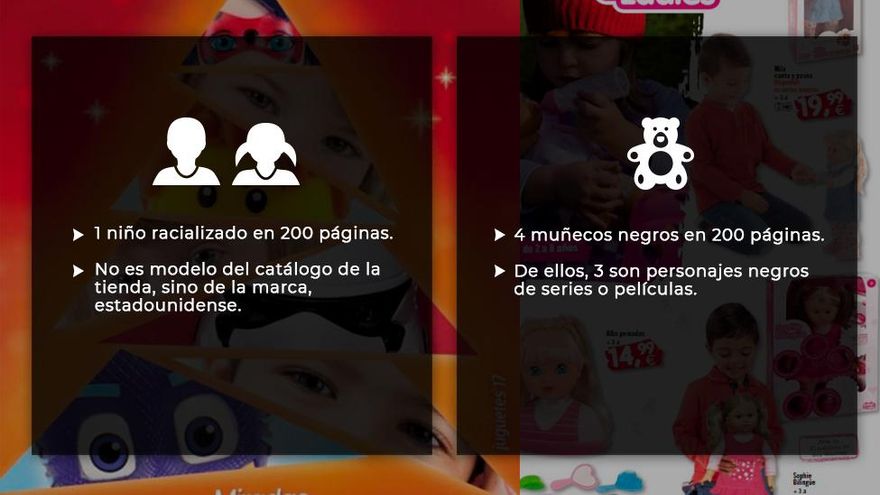 En el caso de Toys'r'us, empresa estadounidense, los modelos racializados son algo más superiores a la media. “La gente coge la revista que llega a casa o dan en la puerta del cole. El catálogo es para vender y estos juguetes 'alternativos', que no lo deberían ser, no salen. Lo que se supone que te da un abanico de posibilidades, te los invisibiliza, se nos invisibiliza. Es como si creyeran que apenas van a venderse y, por tanto, no existen”, criticaba Torres.