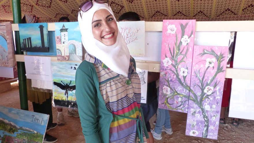 Walaa, de 23, dice que hoy es uno de los días más bonitos de su vida. Con su historia se podría escribir una novela. Lleva 4 meses en el campo de refugiados de Katsikas pero hoy está en el paraíso, porque inaugura la exposición con sus cuadros y porque ha llegado a visitarla al campo el amor de su vida.