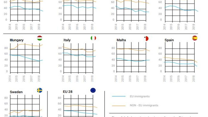 Asimismo, en todos los países europeos analizados menos en dos, Hungría y Suecia, también se ha reducido la visión negativa hacia los inmigrantes que proceden de fuera de la UE. El estudio evidencia que los ciudadanos comunitarios son siempre más aceptados que los que provienen de otras partes del mundo.