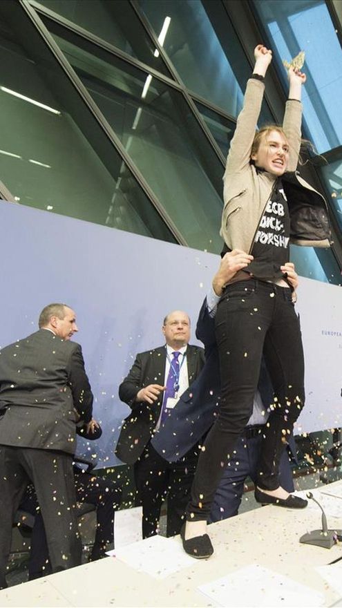 Una activista ha interrumpido este miércoles la rueda de prensa del presidente del Banco Central Europeo (BCE), Mario Draghi, al que ha asaltado en mitad de su comparecencia y, abalanzándose sobre su mesa entre gritos a favor de “acabar con la dictadura del BCE”, ha arrojado confeti.