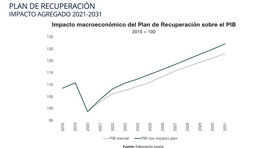El Banco de España calcula que el Plan de Recuperación tendrá un impacto directo sobre el nivel del PIB (Productor Interior Bruto) de un 1,15% en promedio anual en el próximo lustro, que podría elevarse a un 1,75% al tener en cuenta los “efectos de arrastre” entre sectores. El Gobierno viene defendiendo que, en total, los fondos europeos sumarán tres puntos a la actividad económica en España hasta 2031, a un ritmo de más de dos puntos por ejercicio de media.