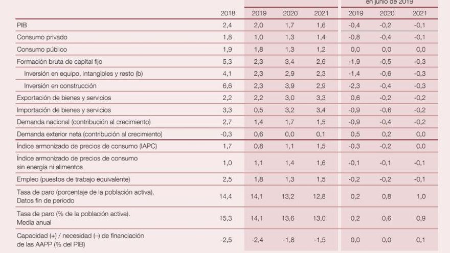 El Banco de España confirma la ralentización de la economía española. El regulador ha publicado este martes sus previsiones en las que señala que “el avance medio del producto interior bruto (PIB) se situaría en el 2% en 2019 y en el 1,7% y el 1,6% en cada uno de los dos años siguientes”. Esto supone una caída de la previsión de crecimiento de cuatro décimas en 2019, dos décimas en 2020 y una décima en 2021 que hizo el Banco de España el pasado junio.