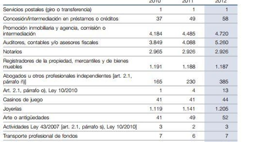 Este colectivo hace autocrítica. Aseguran que son de los que menos están colaborando con la obligación de identificar a sujetos sospechosos. “No tenemos un órgano que nos obligue y nos represente a todos, como les sucede a los notarios, pues el porcentaje de abogados que está dado de alta en el registro de sujetos obligados a reportar información es mínimo (ver gráfico de la memoria del Sepblac)”, explica un abogado especializado en prevención de blanqueo. Y advierte: “Los del GAFI no van a tardar en darse cuenta de que apenas se ha investigado a los abogados, y eso no va a gustar nada”.