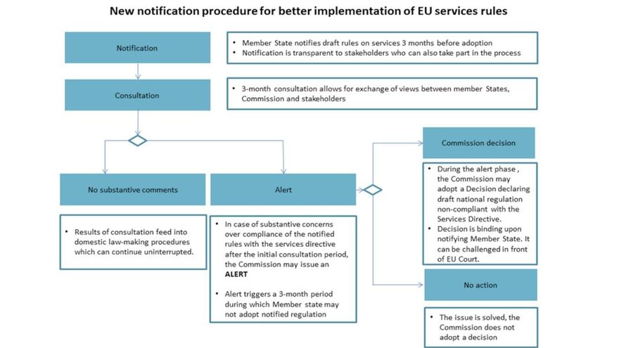 La Comisión, sin embargo, defiende que “la lógica detrás del procedimiento de notificación no es una 'toma de poder de Bruselas'. Brinda a la Comisión y, lo que es más importante, a otros Estados miembros y partes interesadas, la oportunidad de plantear inquietudes sobre posibles inconsistencias con la legislación de la UE a través de un diálogo constructivo al inicio del proceso, en lugar de a través de largos procedimientos de infracción. Esto contribuye a mejorar el entorno empresarial, contribuye a la seguridad jurídica y reduce la necesidad de litigios legales prolongados y onerosos ante los tribunales de la UE. El objetivo de la propuesta legislativa es mejorar la aplicación de la directiva de servicios”.