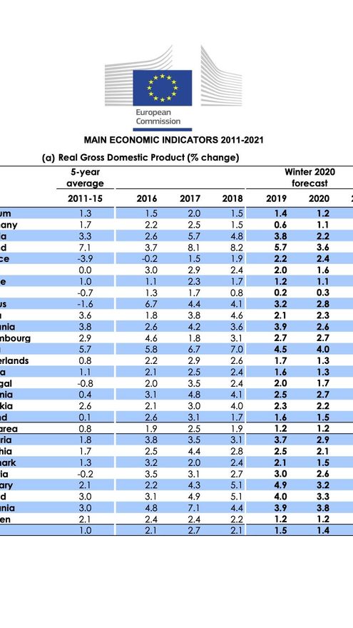El pronóstico calcula que el crecimiento del producto interior bruto (PIB) de la zona del euro se mantendrá estable en 1,2% en 2020 y 2021. Para la UE en su conjunto, se pronostica que el crecimiento disminuirá marginalmente al 1,4% en 2020 y 2021, por debajo del 1,5% proyectado en el Pronóstico económico de otoño de 2019.