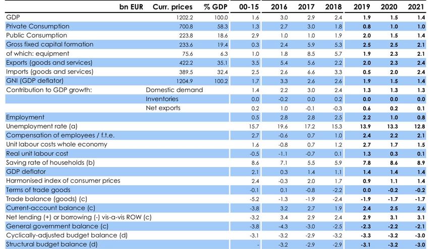 La rebaja de una décima del propio Gobierno de hace tres semanas –del 2,2% al 2,1%– fue achacada a la revisión estadística del INE –una corrección de los datos de crecimiento de la última década a la baja–. Una revisión estadística que, junto con el ambiente depresivo económico de los principales países de la zona del euro –tensiones comerciales con EEUU y China, Brexit, atasco de Alemania...–, dan como resultado el 1,9% que Bruselas adjudica a España para 2019.