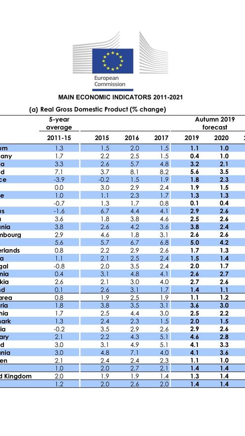 Aún más bajos son los datos de Alemania, al borde del parón. Bruselas prevé que acabe el año con un crecimiento del 0,4%, y espera un repunte hasta el 1% en 2020 y 2021. Pero peor aún es Italia, al borde de la recesión, con un crecimiento previsto del 0,1% en 2019; el 0,4% en 2020 y el 0,7% en 2021. En el lado opuesto se sitúa Irlanda, con una previsión del 5,6% en 2019; 3,5% en 2020 y 3,2% en 2021.