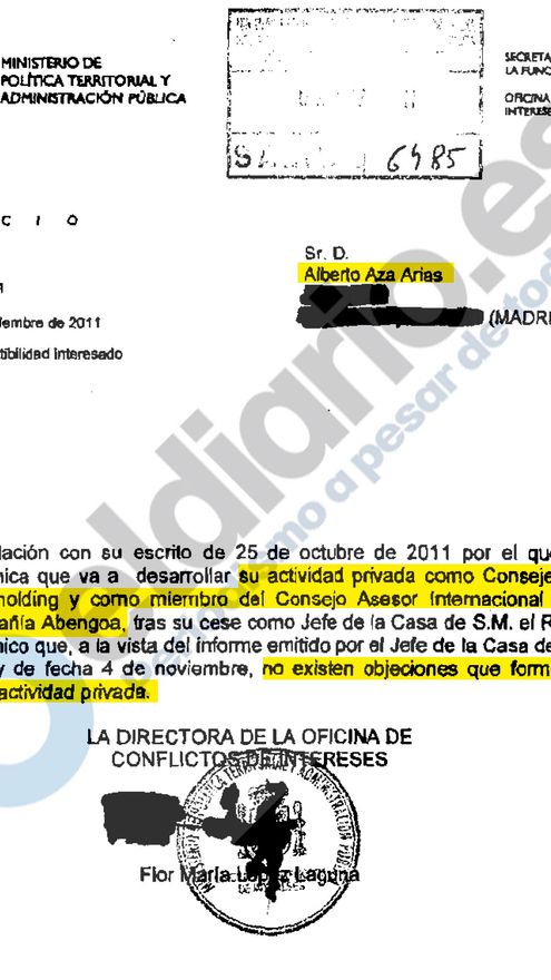 El hombre que llevó a González Cebrián a la Zarzuela, Alberto Aza, también fue autorizado a trabajar para el Ibex tras su cese como jefe de la Casa Real. En noviembre de 2011, justo antes de las elecciones en las que Rajoy consiguió mayoría absoluta, recibió el visto bueno para fichar por La Caixa como consejero, a través de su holding Criteria, y para asesorar a la energética Abengoa. Aza fue miembro del consejo asesor internacional de Abengoa desde noviembre de 2011 hasta el 27 de febrero de 2012, con el permiso de la Oficina de Conflicto de Intereses.