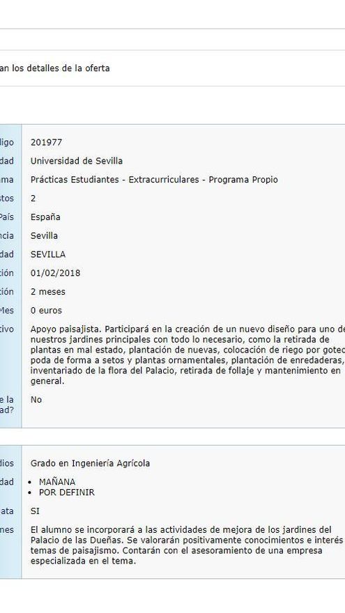 La oferta, que pudo consultar este medio y capturó en una imagen que mostramos más abajo, describia la dotación al mes “0 euros”, así como la duración “2 meses”. La labor de los becarios era la de “apoyo paisajista”, en el que “participará en la creación de un nuevo diseño para uno de nuestros jardines principales con todo lo necesario, como la retirada de plantas en mal estado, plantación de nuevas, colocación de riego por goteo, poda de forma a setos y plantas ornamentales, plantación de enredaderas, inventariado de la flora del Palacio, retirada de follaje y mantenimiento en general”, recogía el anuncio.