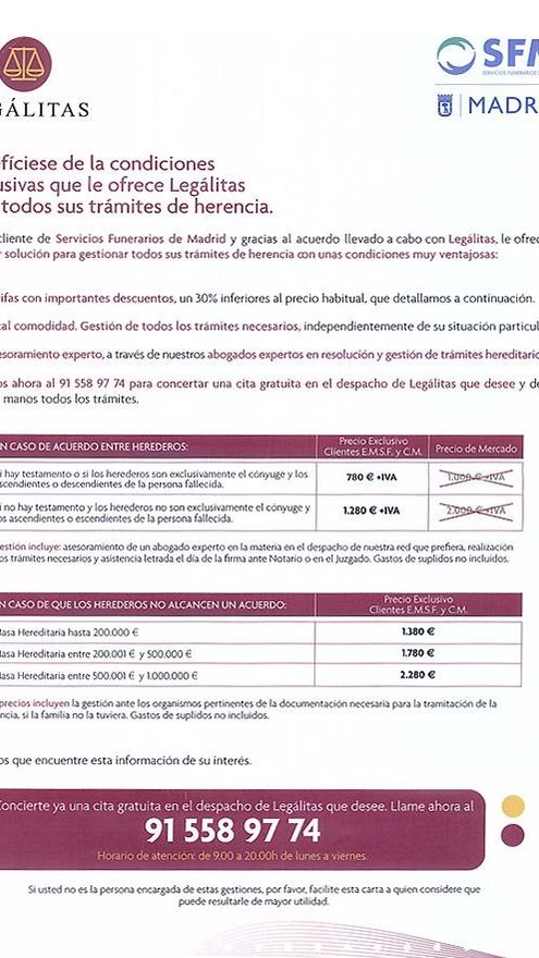 Cuando el pasado martes 4 de febrero la abogada de familia Sofía García-Hortelano Martín-Ampudia abrió el buzón de su casa encontró una carta de los Servicios Funerarios de Madrid (SFM). Se trataba del certificado de defunción de su madre, la traductora María Jesús Martín–Ampudia, fallecida una semana antes, un envío que se hace de oficio por parte del Ayuntamiento. Dos páginas del Registro Civil necesarias para aportar en bancos, organismos oficiales o testamentaría. Su sorpresa llegó cuando volteó la última página del certificado y se encontró, grapada, una publicidad de la empresa Legálitas con el membrete del Ayuntamiento y de los servicios funerarios, ofreciendo sus servicios jurídicos para los trámites de la herencia a cambio de un descuento.