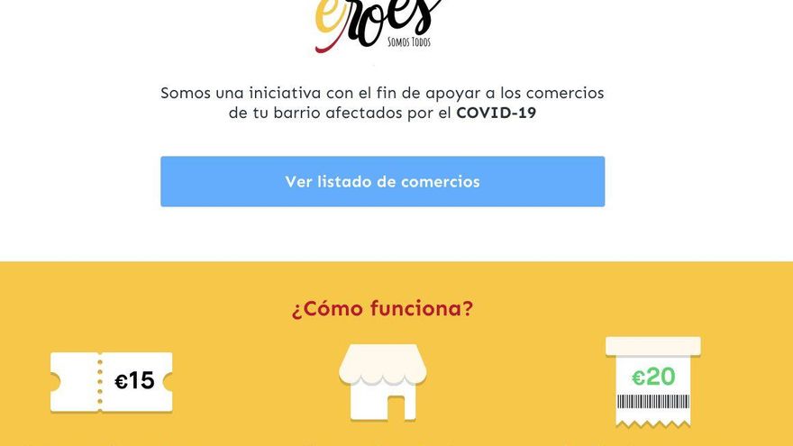 La web en cuestión se llama Éroes Somos Todos y se presenta como “una iniciativa con el fin de apoyar a los comercios de tu barrio afectados por el COVID-19”. La idea, que sigue activa, consiste en vender bonos por adelantado para dotar de liquidez a los comerciantes. “Compra un bono ahora. El comercio recibe tu ayuda. Con ese dinero podrá suplir sus costes durante el estado de alarma. Canjea tu compra con 5 euros de descuento. Cuando reabra, podrás consumir por valor de 20 euros”, rezan las instrucciones. El proyecto aparece respaldado por Google. Hasta ayer también incluía un logotipo del Ayuntamiento de Madrid.