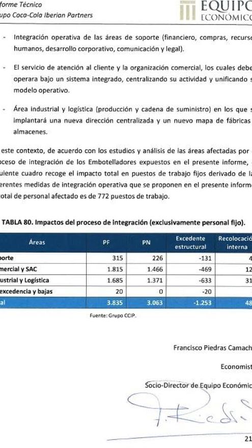 En cualquier caso, el informe elaborado por Equipo Económico de 214 páginas al que ha tenido acceso eldiario.es constituye, básicamente, una recopilación bastante reiterativa de los motivos que, a su juicio, hacen necesario el ERE, justificando, además, la fusión de las embotelladoras (ahora denominadas Coca-Cola Iberian Partners) hace menos de dos años. Detrás de esta decisión está, abiertamente, la mano de Coca-Cola Company, aunque la multinacional justifique ahora el ERE como una decisión de su socio español.